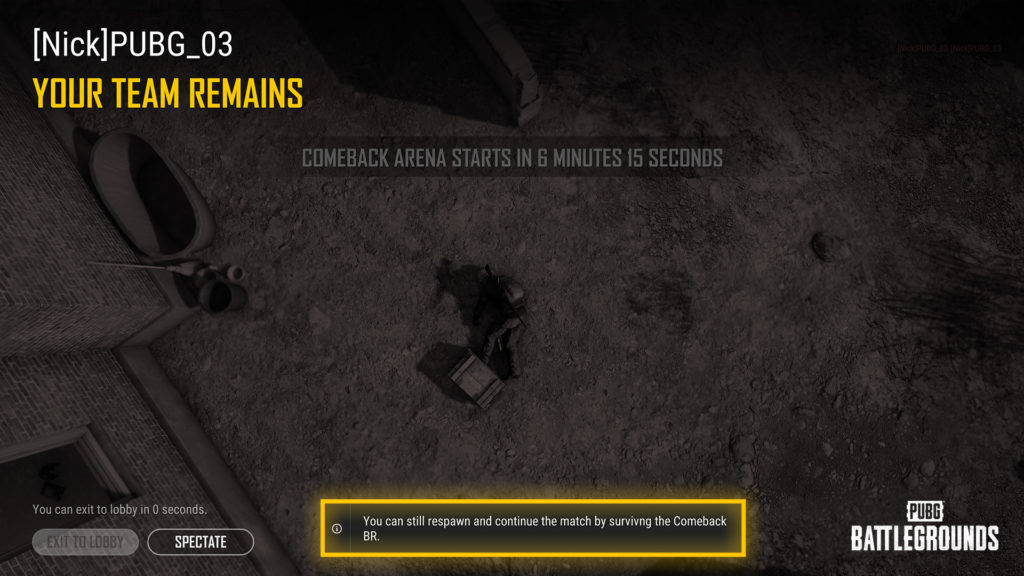 - 복귀전 참여 대상인 상태에서 사망 시 “로비로 나가기” 버튼이 3초 뒤 활성화 됩니다.